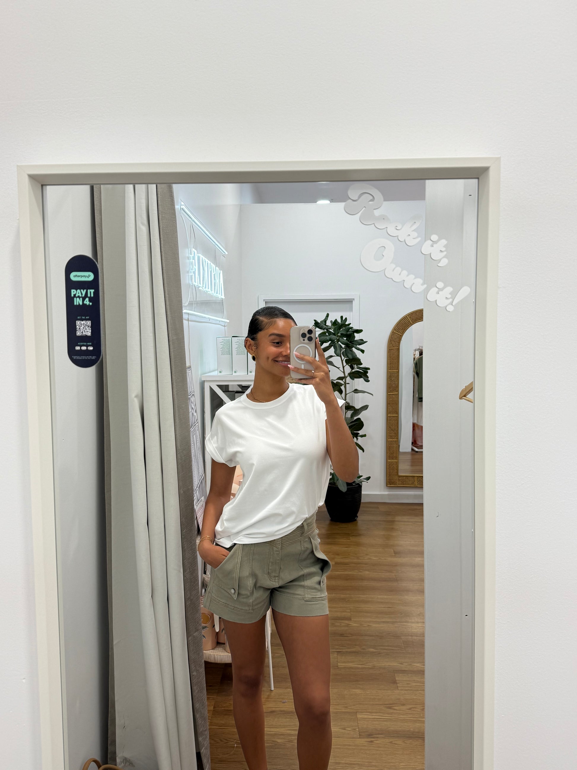 Jump on board the utility trend with these khaki Country Denim Shorts. For off-duty chic, team with a logo tee or dress up with a camisole.